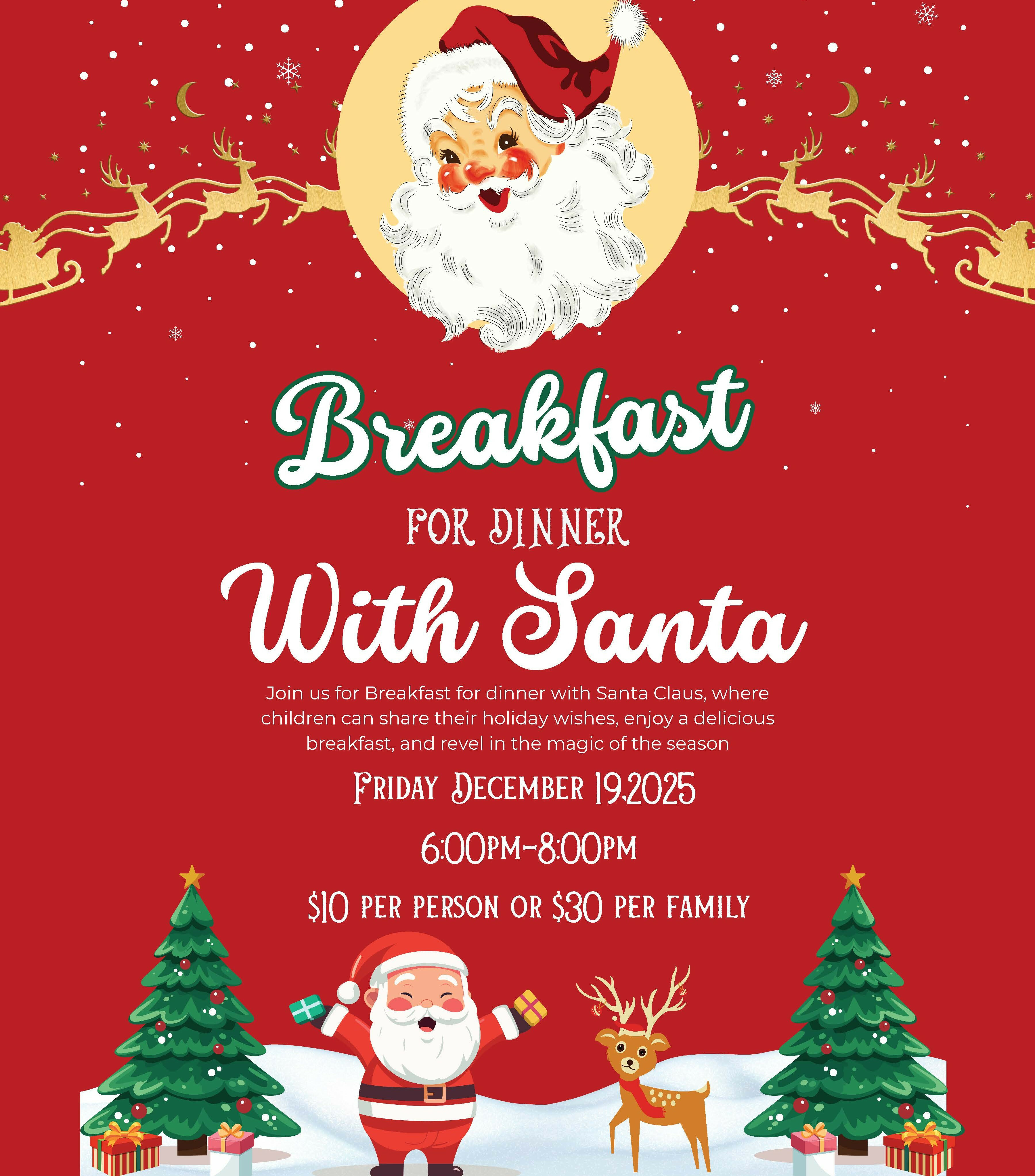 Join us for Breakfast for dinner with Santa Claus, where children can share their holiday wishes, enjoy a delicious breakfast, and revel in the magic of the season. The drawing for the Super Raffle will also be held at the dinner.